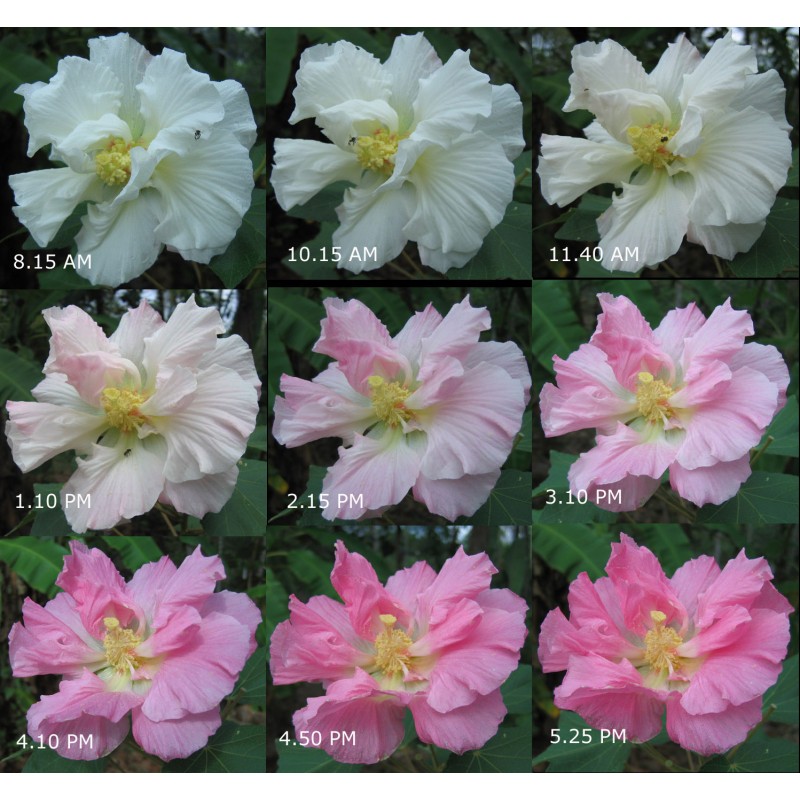 Nyár végén, kora ősszel virágzik. Előbb tiszta fehér színű, majd mély rózsaszín, elnyílásban egész sötét árnyalatú lesz a virág.