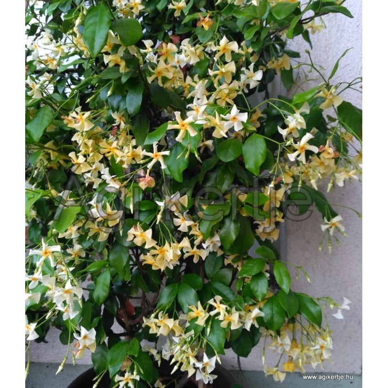 Örökzöld, fásszárú, csavarodva kúszó növény. A jázmin illatú virágok sárgák, csokrosak, májustól elborítják a növényt. Tavasztól őszig virágzik. Déli fal elé, védett helyre kiültethetjük. Napos, félárnyékos fekvést igényel. Jó vízelvezetésű talaj, közepes víz, közepes műtrágya, és növény támasz szükséges.