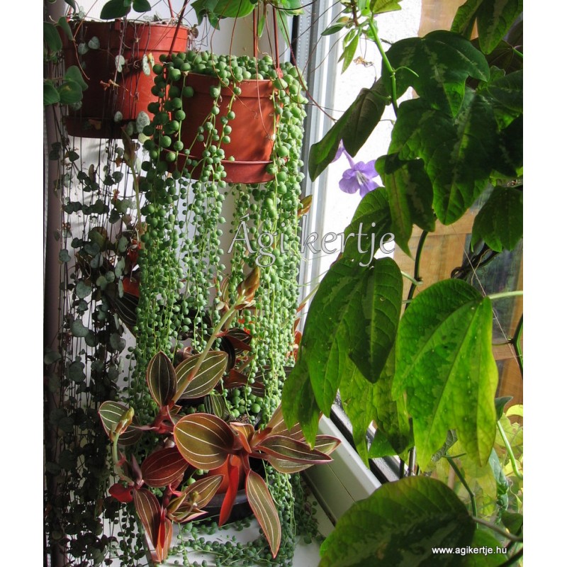 Vékony, lelógó hajtásain fejlődő levelei borsószemekre hasonlítanak, tömött fürtöt alkotnak. Tavasztól kezdve, fehér virágok megjelenésére is számíthatunk, amik pamacsokra hasonlítanak és illatosak. Igénye és gondozása, a többi pozsgás növényéhez hasonló. Napos, világos, kellemesen meleg helyet válasszunk neki, ahol hajtásai szabadon csünghetnek. Kevés öntözést igényel, télen tartsuk szinte teljesen szárazon a földjét.